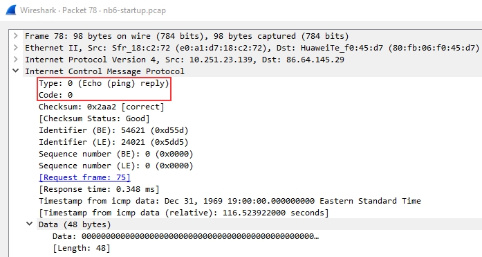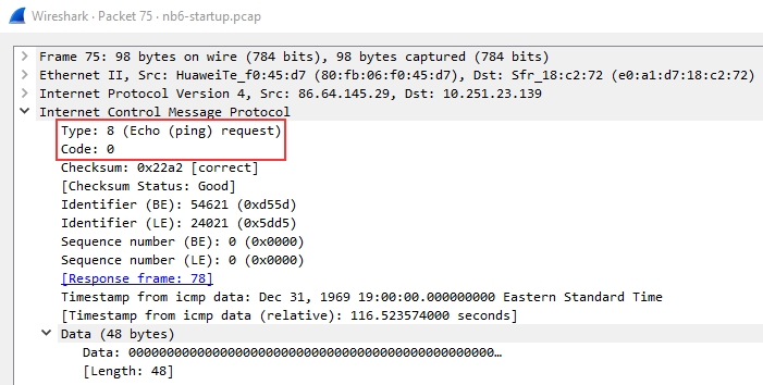 There are two other details within the packet that are useful to analyze: timestamp and data. The timestamp can be useful for identifying the time the ping was requested it can also be useful to identify suspicious activity in some cases. We can also look at the data string which will typically just be a random data string.