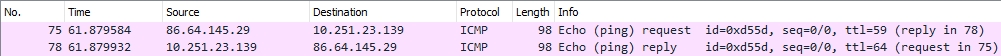 Below you can see a sample of what a ping would look like, we can see a request to the server from ICMP, then a reply from the server.
