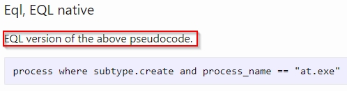 Under Implementations, pseudocode is provided and an EQL version of the pseudocode. EQL (pronounced as 'equal'), and it's an acronym for Event Query Language. EQL can be utilized to query, parse, and organize Sysmon event data. You can read more about this here.