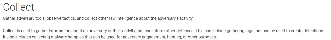 Let's click on Collect. At this point, we should already be familiar with how MITRE displays the information to us. Here we see a brief definition of tactic, Collect, and associated ID along with the list of techniques, each with a brief description.